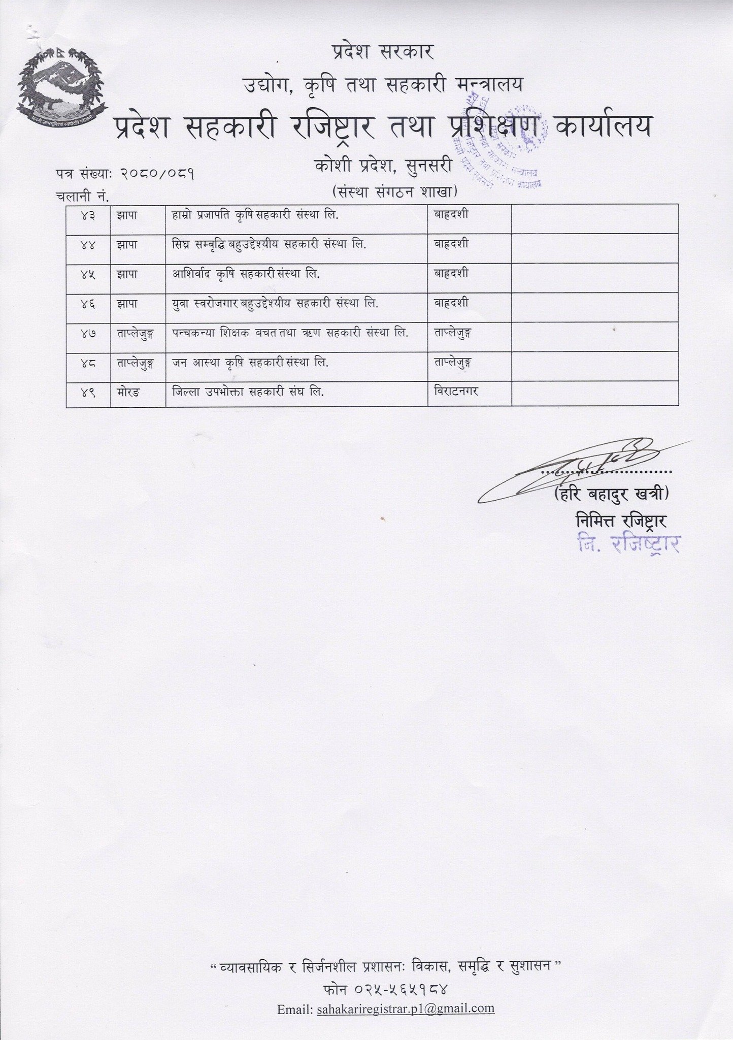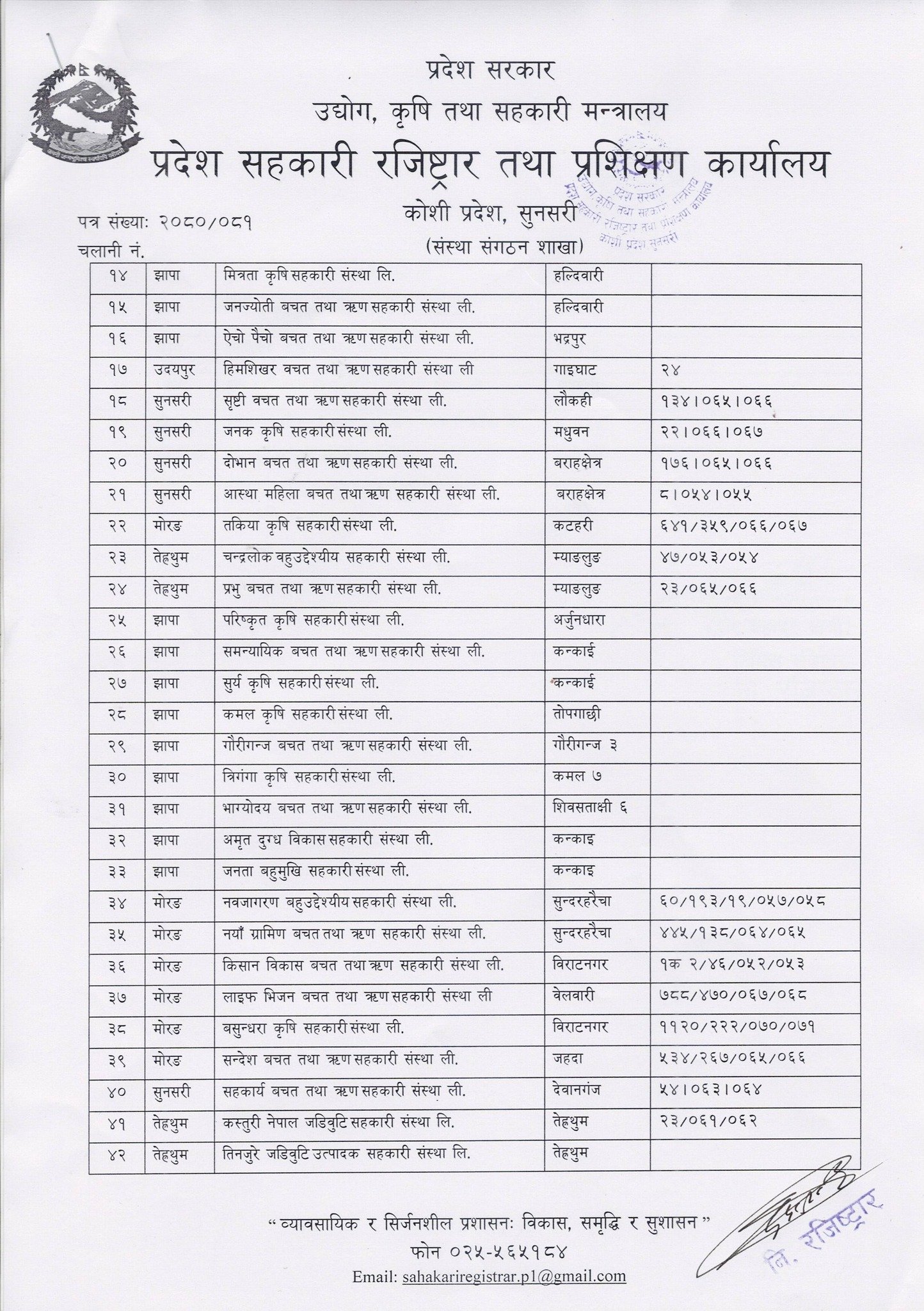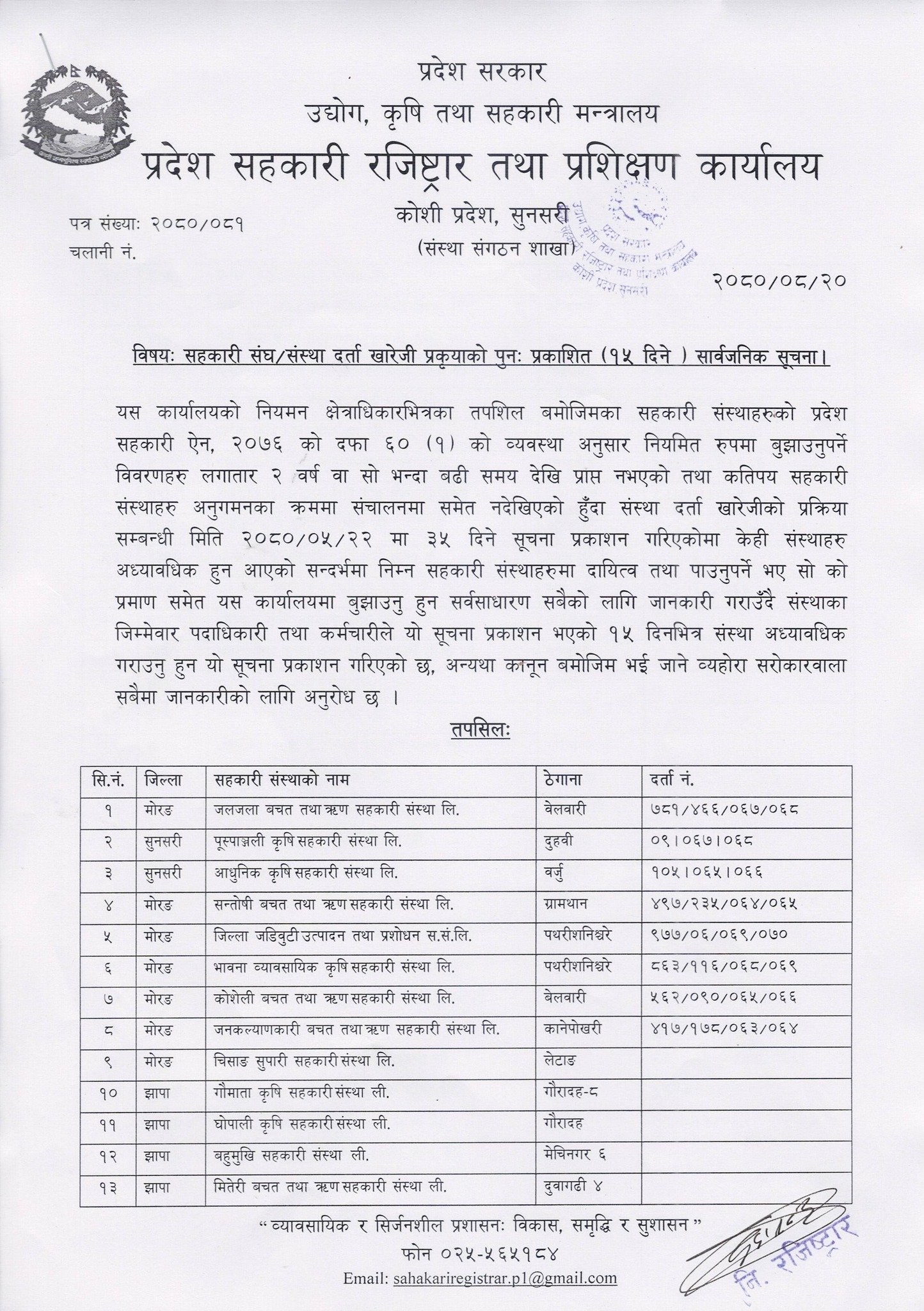 यस कार्यालयको नियमन क्षेत्राधिकारभित्रका तपशिल बमोजिमका सहकारी संस्थाहरुको प्रदेश सहकारी ऐन अनुसार नियमित रुपमा बुझाउनुपर्ने विवरणहरु लगातार २ वर्ष वा सो भन्दा बढी समय देखि प्राप्त नभएको र कतिपय सहकारी संस्थाहरु अनुगमनका क्रममा संचालनमा समेत नदेखिएका संस्था दर्ता खारेजीको प्रक्रिया सम्बन्धी यही भदौ २२ गते ३५ दिने सूचना उक्त कार्यलयले प्रकाशन गरेको थियो ।