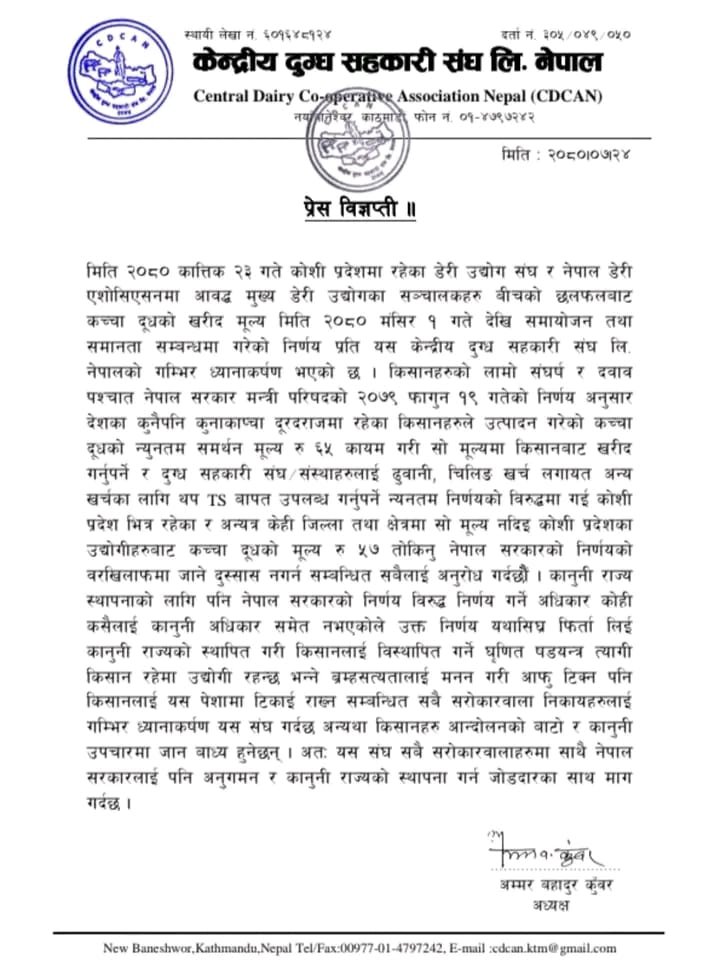 केन्द्रीय दुग्ध सहकारी संघको प्रेस विज्ञप्ती