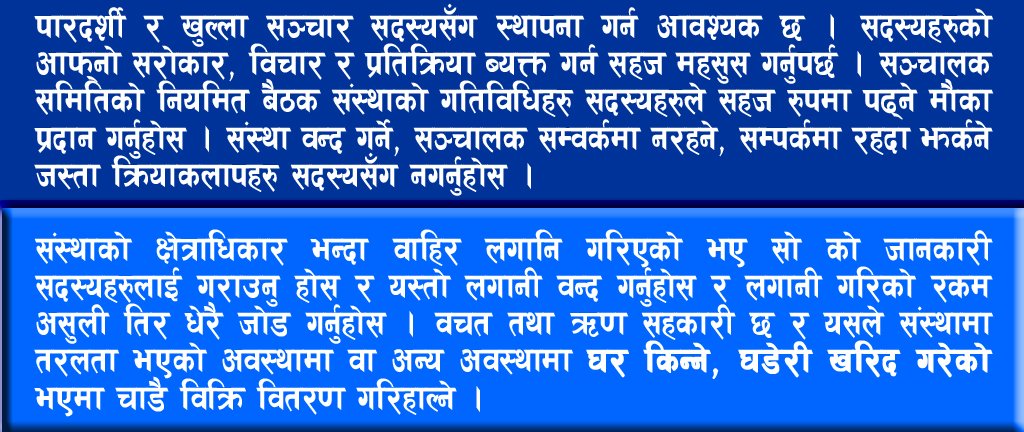 ४. निष्पक्ष व्यवहार : सबै सदस्यहरूको व्यवहारमा निष्पक्षता र समानता सुनिश्चित गर्नुहोस् । भेदभाव वा पक्षपातको कुनै पनि मुद्दालाई तुरुन्तै सम्बोधन गर्नुहोस् । संस्था अप्ठ्यारो अवस्था वा वचत फिर्ता गर्न नसक्ने अवस्था आएको खण्डमा सञ्चालक समिति वा कर्मचारीका आफन्तहरूलाई पहिले फिर्ता नगर्नुहोस् । निष्पक्ष व्यवहारले सदस्यहरू बीच विश्वास र वफादार बनाँउछ ।