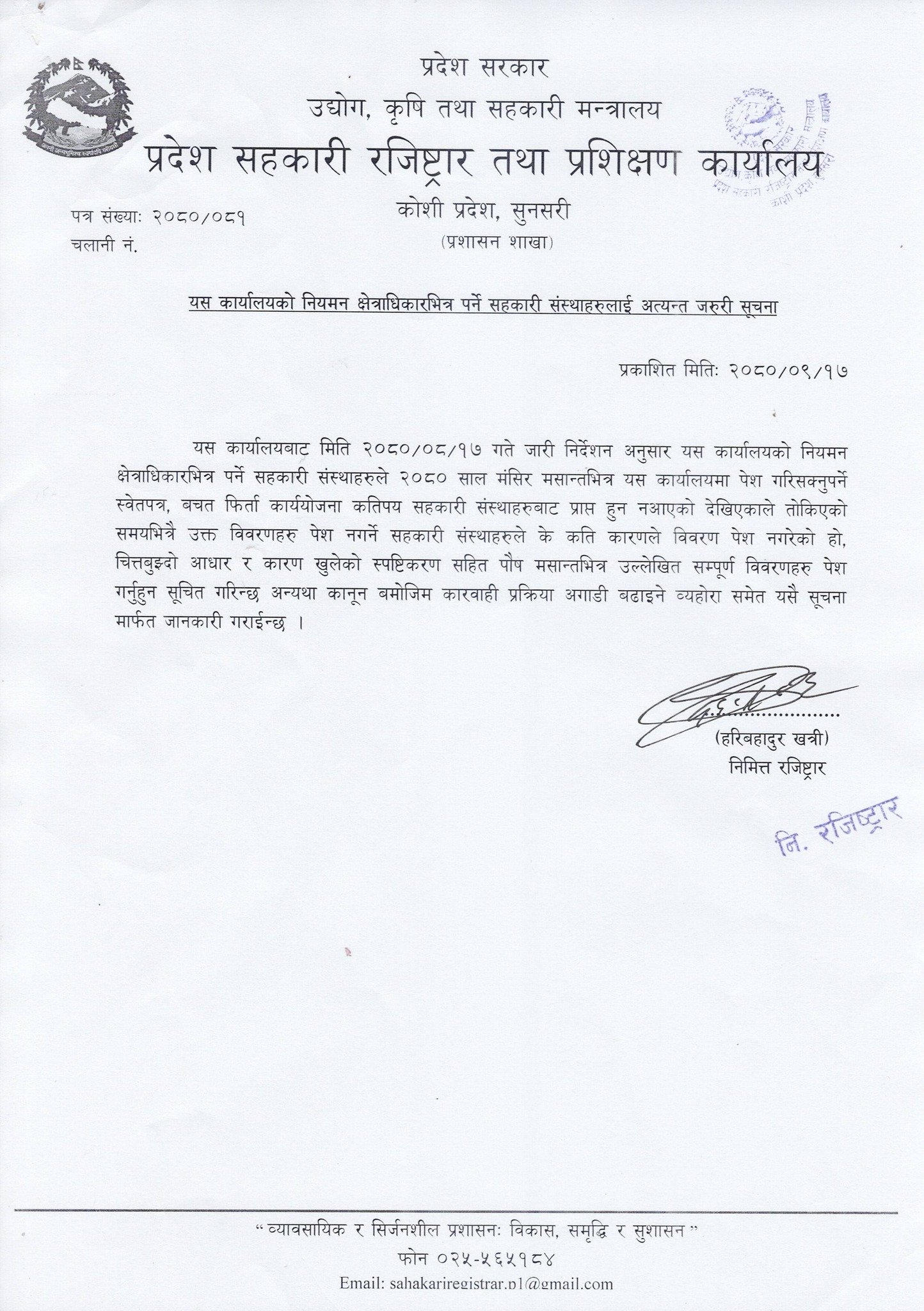 प्रदेश सरकार उद्योग, कृषि तथा सहकारी मन्त्रालय प्रदेश सहकारी रजिष्ट्रार तथा प्रशिक्षण कार्यालले आफ्नो नियमन क्षेत्राधिकारभित्र पर्ने सहकारी संस्थाहरुलाई सूचना जारी गरेको छ ।