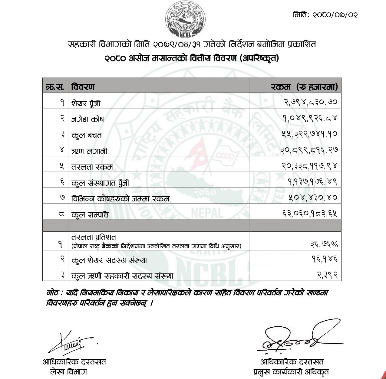 निक्षेपमा उच्च गिरावट आएपछि असोज महिनामा बैंकको तरलता अनुपात पनि घटेको छ । भदौमा बैंकमा ३९.०७ प्रतिशत तरलता अनुपात रहेकोमा असोजमा ३६.७६ प्रतिशतमा झरेको छ । यसैगरी भदौको तुलनामा असोजमा बैंकका सदस्य संख्या बृद्धि भएपनि ऋणीको संख्या भने घटेको मासिक वित्तीय विवरणमा उल्लेख छ ।