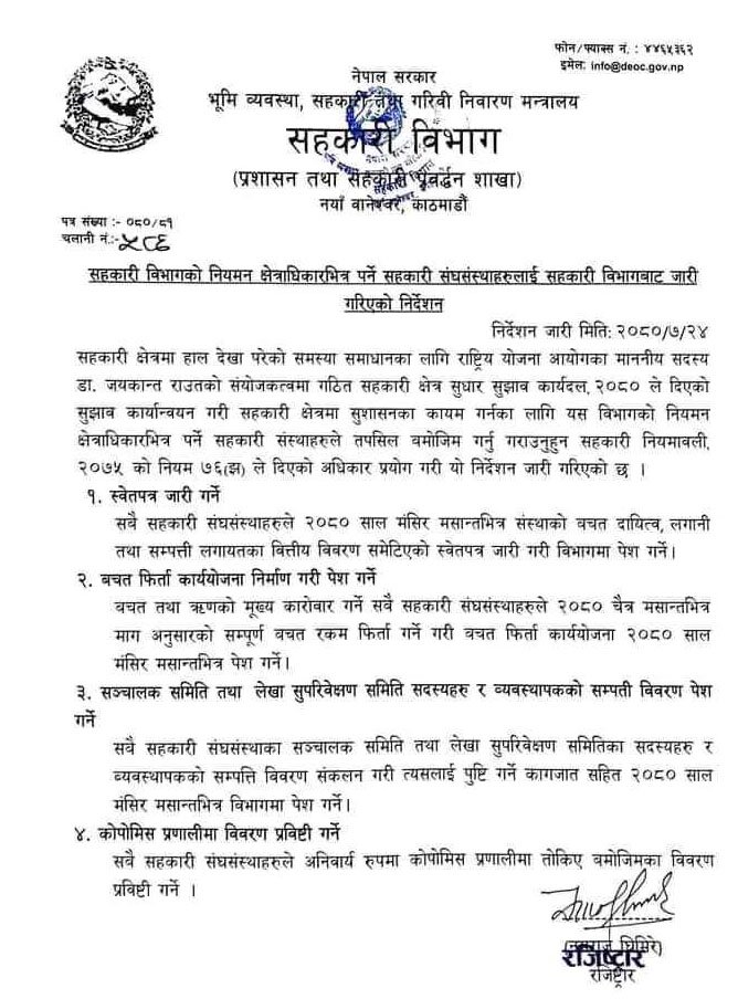 राष्ट्रिय योजना आयोगका माननीय सदस्य डा. जयकान्त राउतको संयोजकत्वमा गठित उक्त सहकारी क्षेत्र सुधार सुझाव कार्यदलले दिएको सुझाव कार्यान्वयन गरी सहकारी क्षेत्रमा सुशासन कायम गर्नका लागि विभागको नियमन क्षेत्राधिकारभित्र पर्ने सबै सहकारी संस्थाहरुले तपसिल बमोजिम गर्नु गराउनुहुन सहकारी नियमावलीले दिएको अधिकार प्रयोग गरीने भनि उक्त निर्देश जारी गरेको हो ।