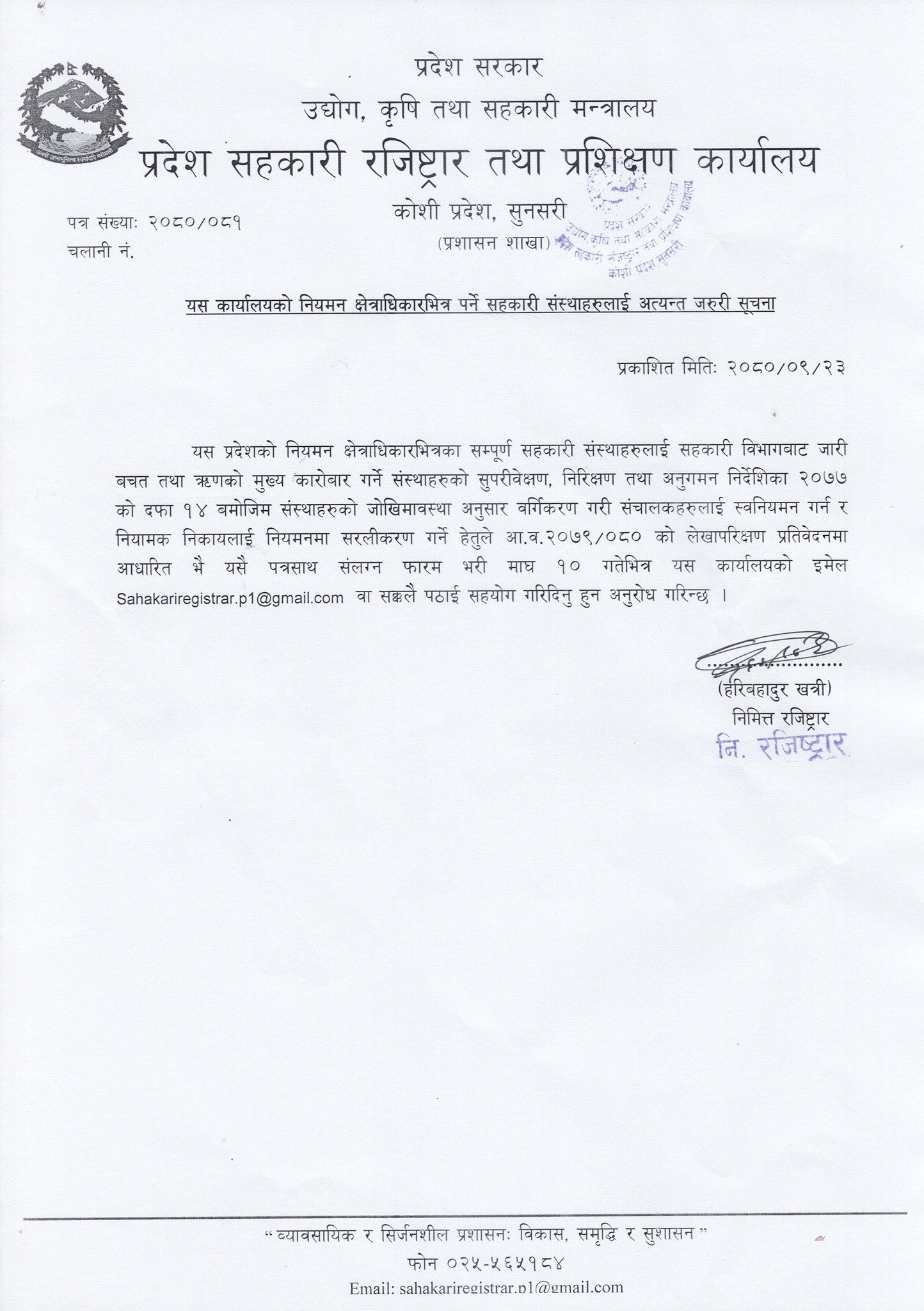 काेशी प्रदेश सहकारी रजिष्ट्रार तथा प्रशिक्षण कार्यालयले नियमन क्षेत्राधिकारभित्र पर्ने सहकारी संस्थाहरुलाइ सुचना जारी गरेको छ जारी सुचना अनुसार ः यस प्रदेशको नियमन क्षेत्राधिकारभित्रका सम्पूर्ण सहकारी संस्थाहरुलाई सहकारी विभागबाट जारी बचत तथा ऋणको मुख्य कारोबार गर्ने संस्थाहरुको सुपरीवेक्षण, निरिक्षण तथा अनुगमन निर्देशिका २०७७ को दफा १४ बमोजिम संस्थाहरुको जोखिमावस्था अनुसार वर्गिकरण गरी संचालकहरुलाई स्वनियमन गर्न र नियामक निकायलाई नियमनमा सरलीकरण गर्ने हेतुले आ.व.२०७९/०८० को लेखापरिक्षण प्रतिवेदनमा आधारित भै यसै पत्रसाथ संलग्न फारम भरी माघ १० गतेभित्र यस कार्यालयको इमेल Sahakariregistrar.p1@gmailcom वा सक्कलै पठाई सहयोग गरिदिनु हुन अनुरोध गरिन्छ । भनिएको छ ।