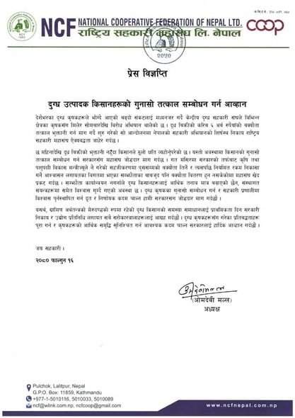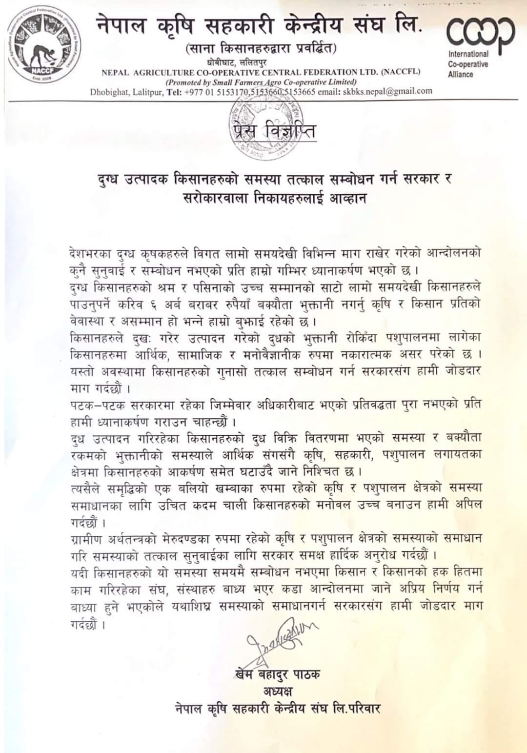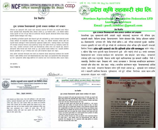 दूघ उत्पादन किशानहरुको मागलाई तत्काल सम्बोधन गर्न प्रदेश कृषि सहकारी संघ लि.,राष्ट्रिय सहकारी महासंघ लि., केन्द्रीय पशपन्छी मत्स्य सहकारी संघ लिमिटेड, सामाजिक संजाल नेपाल(सेवा नेपाल) तथा नेपाल कम्युनिष्ट पार्टी(एमाले)ले आव्हान गरेको छ ।