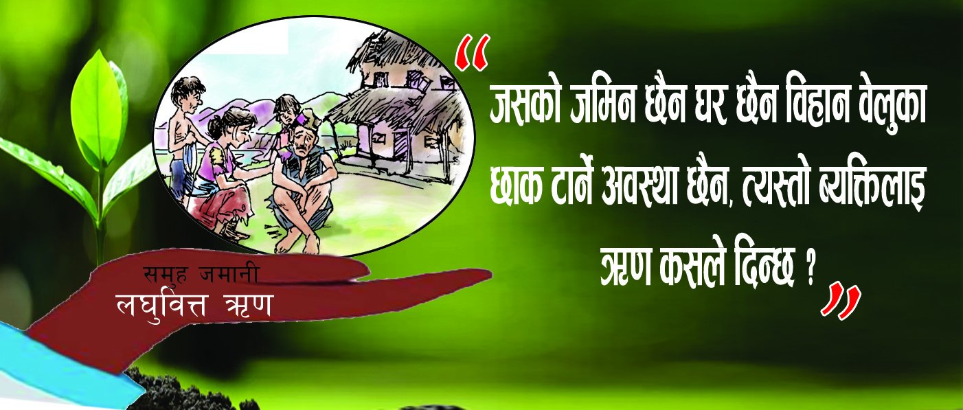 ग्रामिण भेगमा वसोवास गर्ने जसको जमिन छैन घर छैन विहान वेलुका छाक टार्ने अवस्था छैन, त्यस्तो ब्यक्तिलाइ ऋण कसले दिन्छ ? यसवारे चिन्तन गर्दा भन्न सकिन्छ कि त्यो समुह जमानीमा लघुवित्त ऋण नै हो । यसो भए सहकारी मार्फत लघुवित्त ऋण लिने सदस्यहरुले आफ्नो ऋणको किस्ता अनिवार्य तिरेमा मात्र फेरी अर्को सदस्यले ऋणको सुविधा उपभोग गर्न पाउँछ, अन्यथा एक जनाको कमीकमजोरीले समुदाय नै पीडित हुने कुरामा निन्न आय भएकाले सोच्नै पर्ने हुन्छ । लघुवित्तमा ब्यक्ति हेरेर एकल लगानी गर्नुपर्ने मोडल नेपालमा विकसित भएपनि त्यसले हुनेखाने र सम्पन्न बर्गलाई नै पक्षपोषण गर्ने भएकाले सामुहिक जमानीमा निम्नस्तरको ब्यक्तिलाई फाइदा पुग्छ ।