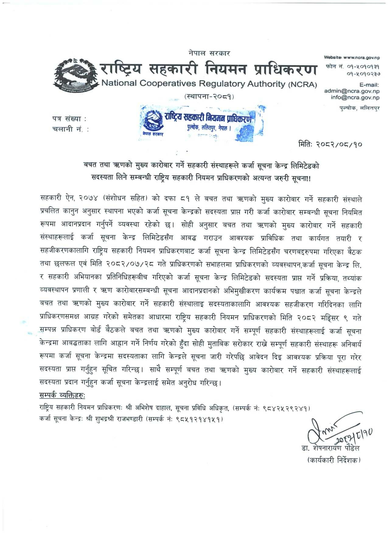 सहकारी नियमन प्राधिकरणमा दर्ता भएर सञ्चालनमा रहेका सहकारी संस्थाहरूले अब अनिवार्य रूपमा कर्जा सूचना केन्द्र (CIB) मा आफ्नो संस्था दर्ता गर्नुपर्नेछ।